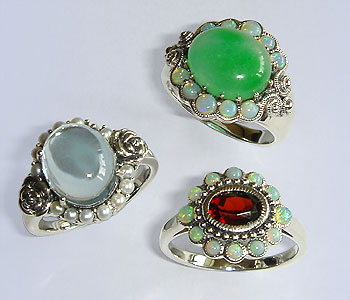Der Silberschmuck ist mit echten und natürlichen Edelsteinen (Rubin, Smaragd, Saphir, Turmalin, Aquamarin, Koralle, Opal) und Halbedelsteinen (Amethyst, Citrin, Granat, Türkis, Peridot, Onyx) besetzt.
